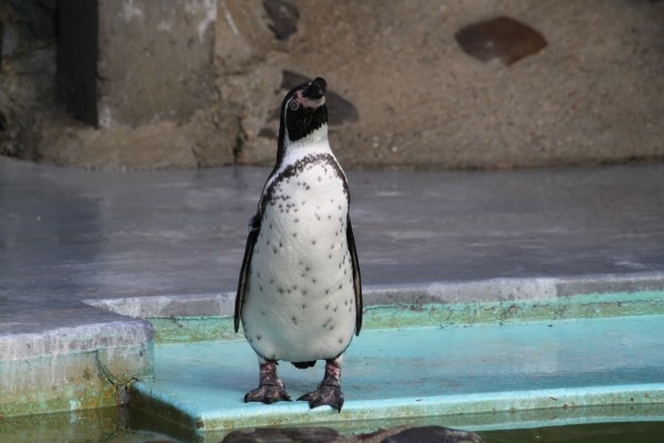 ですが、いつも皮膚が露出していては、本人(ペンギン)が寒かったり水がしみこんだりします。そこで、普段は羽毛でキッチリとふさいで隠してあります(モデルは京都市動物園のフンボルト)。上の越前個体は換羽が終了していなくて羽が伸びきっていないため、見えちゃってたのです。