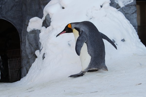 旭山動物園の冬は、雪です。ペンギンが踏み固め、寒さで凍り、ツルツルになってしまいました。坂を慎重に下るフンボルトをじっと観察しているようなキング。