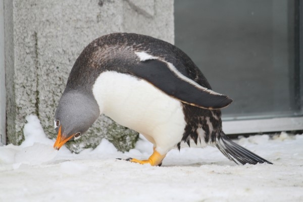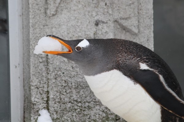 旭山動物園のジェンツーが雪塊で遊んでいますが、なんか顔がヘンじゃない? 目の下が白かったっけ?