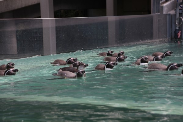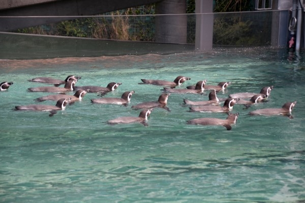 森きららのフンボルト集団、そろってわしわしと泳いでいます。おや、真ん中にいるのは亜成鳥ですね。先輩たちに負けず、頑張っています。