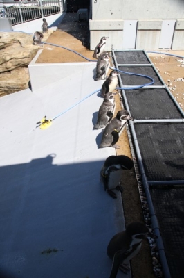 森きららのフンボルト、お食事後のくつろぎタイムに横並び。プールから上がってくるスロープの頂上が人気のようです。