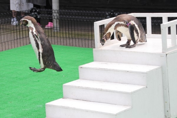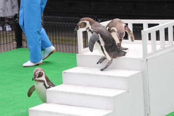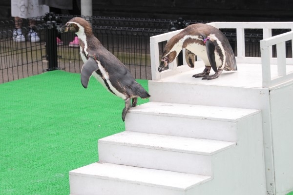 越前松島水族館の、フンボルトペンギンのお散歩。お立ち台の上から1段降りると、