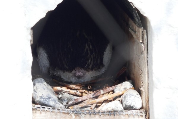 でも、少し後には親の抱卵姿が。よかった。ほんのちょっとの間、身体を伸ばしに出ていたのかもしれませんね。巣穴の暗いところにぼんやりと白っぽく写っているのは、飼育場を覆う野鳥除けネットです。