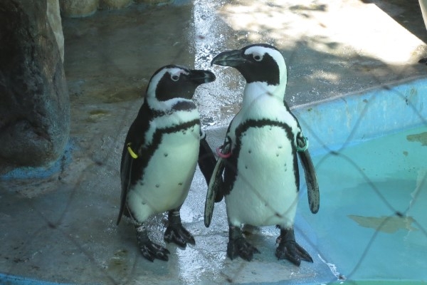上野のケープです。左のケープは胸に2本線があって、ちゃんと背中側の黒い部分とつながっており、マゼランペンギン柄になっています。右個体は標準柄。前回写真のつんつん羽ケープは、1本線の上に横長の黒斑がありました。ケープペンギンの胸の模様にはわりとバリエーションがあります。