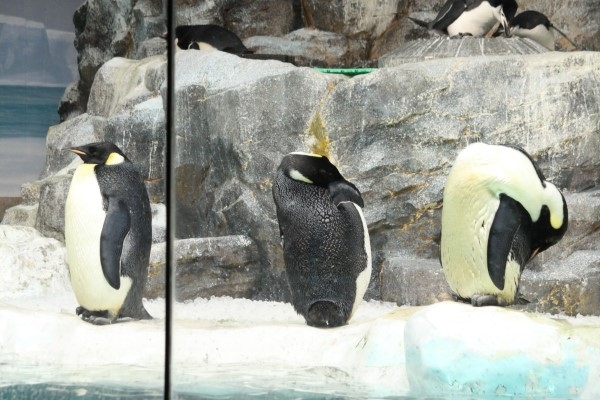 名古屋港水族館のエンペラーです。左端個体のような直立姿勢から、右端のお餅みたいにもっちりと伸びて曲がる首がけっこう長いです。首を伸ばすと、側頭部の薄黄色斑は閉じた形ではなくて胸の薄黄色部分とつながっているのが、よくわかります。