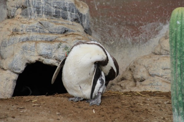 こちらは、同じく羽づくろいをしている越前フンボルトをハラの側から見たところです。伸ばした首と体側の間にスキマはありませんが、じゅうぶんにクチバシは届いています。