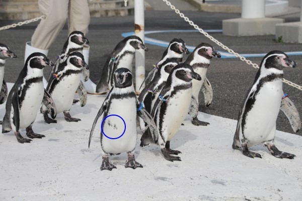 ペンギンはどれでもだれでも同じように見える感じですが、よく見るとお顔も体つきも行動パターンもそれぞれ異なります。そして何より、斑点のある種だと、みんな斑点模様で自己主張しています。丸印は、私のお気に入りフンボルト、越前松島水族館の若手『青青ちゃん』の模様。ちょっと変わったパターンです。