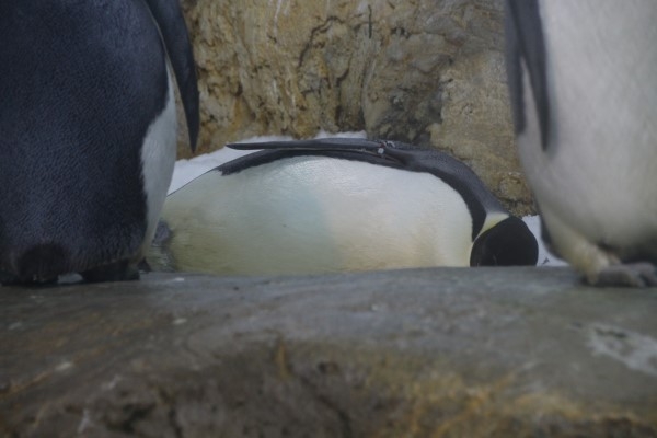 前回の続きです。キングにシッポや足をちゅくちゅくされてビックリした寝ころびエンペラー。はらばいのまま前進して仲間の後ろへ来ると、そこでなぜか横向きに。このようにハラを横に見せて寝転がるのは、ペンギンでは珍しいと思います。