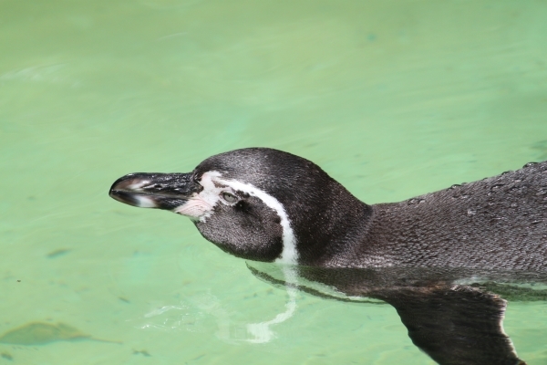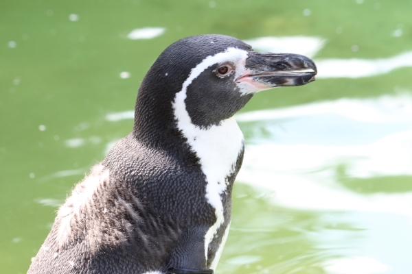 京都市動物園旧ペンギンプールでの写真。換羽終了間近で、背中にもへもへ旧羽が残っています。フンボルトなのにクチバシの付け根が白いのは、うっすらと白い羽が生えているから。換羽後しばらくの期間限定ファッションです。そのうちに抜け落ちて、ピンクの地肌が露出します。で、目の色。茶色っぽいですね。