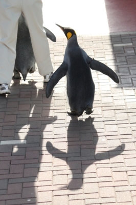 アドベンチャーワールドで、ある冬の日。パレードから引き上げるキングが、しっかりとペンギン形の影を連れていました。飼育員さんに手を添えてもらって歩く同僚をちょっとうらやましそうに見ているようなのも、かわいい。