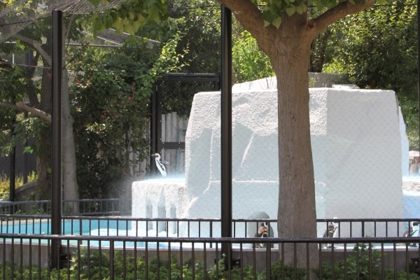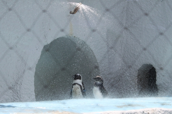 上野動物園のペンギンプール、勢いよく吹き出すシャワーで、水煙があがっています。それを背中に受けて涼むケープ。