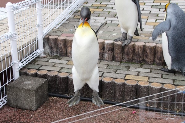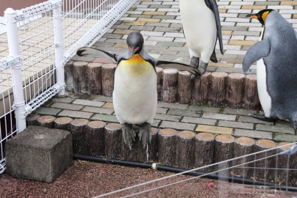前回からの続きです。アドベンチャーワールドでイベントに出場中のキングたちが階段で遊んでいました。前回写真のキングが、もう1段降りようとしています。えいっと飛び降りる踏み切りの瞬間。