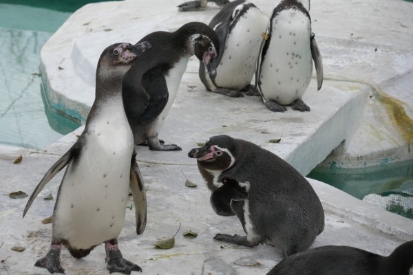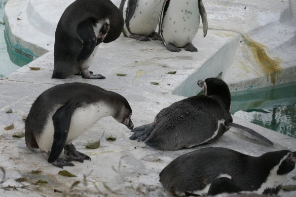 天王寺動物園ペンギンプールのある日。フンボルト若鳥が、のんびり寝ころんでいるオトナの足をつんつん、