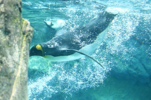 旭山動物園のペンギンプール、ペンギンたちが豪快に泳いでいる図です。キングが力強く潜水をはじめました。