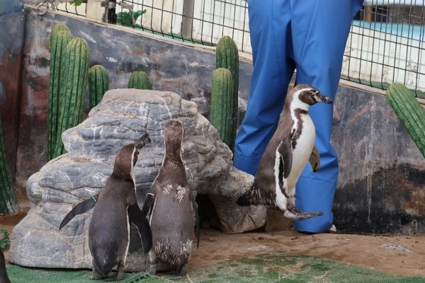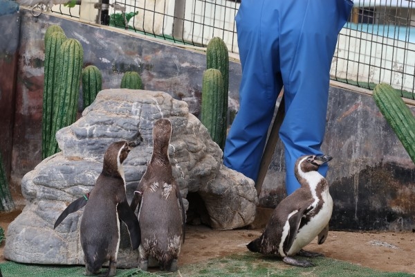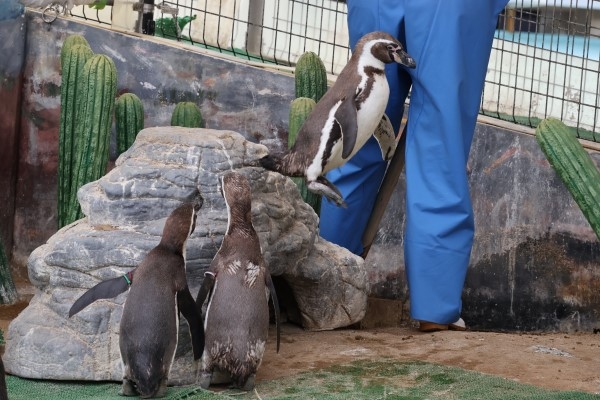 越前松島のフンボルトペンギン、ぐうっと前に倒れて、今まさに飛び降りようとしています。仲間が下で見守っているふう。