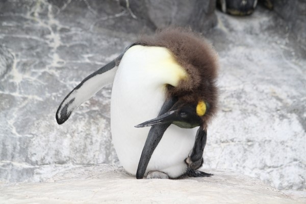 こちらはキングの亜成鳥@登別マリンパークニクス。ヒナのほわふわ幼綿羽をまだ残す御子様ですが、オトナとおなじようにカキカキ。ただし、これまでの例では『立って』いましたが、この亜成鳥は『すわって』掻いています。こういうやり方もあるんですね。