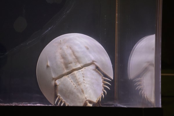なんだか、マリオネットふうのお面がおいてあるみたいに見えてしまうカブトガニでした。左右にぽっちりと『目』にみえるところは、ほんとうに目なんだそうです。@越前松島水族館