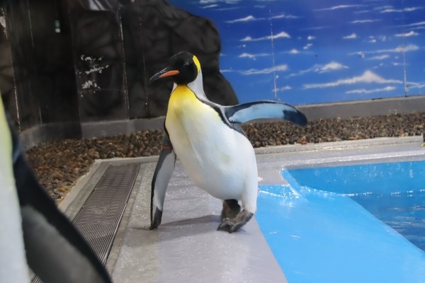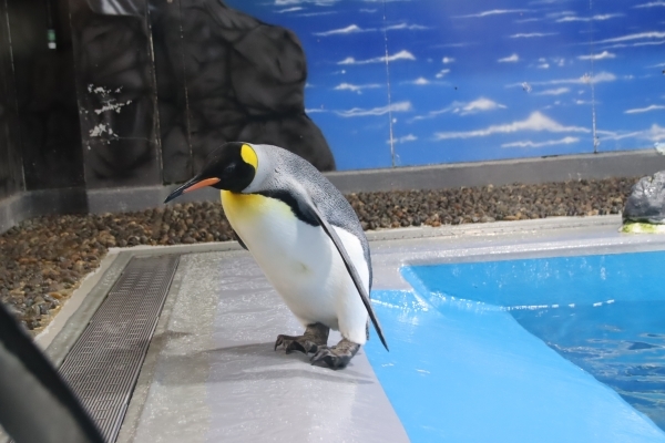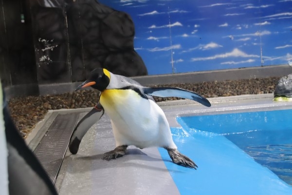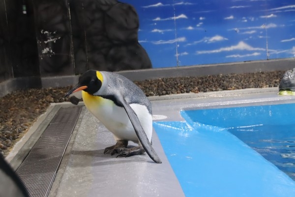 おっと、越前松島水族館のぺんぎん館、プールの上陸スロープで足をすべらせたキング。
