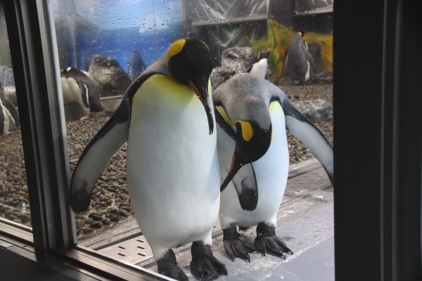 越前松島水族館のキング、このペアはいつも仲良しです。手前のカレシ君のお世話(羽づくろい)をするカノジョさんでした。