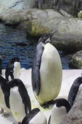 アデリーの群に1羽まじっているのはエンペラーの亜成鳥。ヒナ姿から着替えたばかりなので、まだ御子様です。身体が小さくても、アデリーたちの方が大人なんです。@アドベンチャーワールド