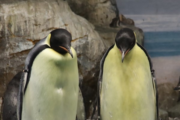 名古屋港水族館のエンペラー2羽、なにやらかしこまっているふう。首を引っ込め、上体を少し前かがみにしています。特に向かって右のエンペラーは、腕(フリッパー)を身体にぴったりとつけているのが緊張感の現れに見える・・・のは、気のせい。極寒地に住むエンペラーは、体温維持策として、フリッパーをやたらに広げることを避けています。