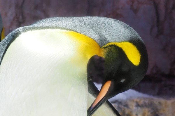 首を曲げたり伸ばしたりしても、胸のオレンジ色とは微妙につながらないのがふつうです。極細い黒線で仕切り線が入っています。モデルは海遊館の女王様、私的に呼んでコミミちゃん。