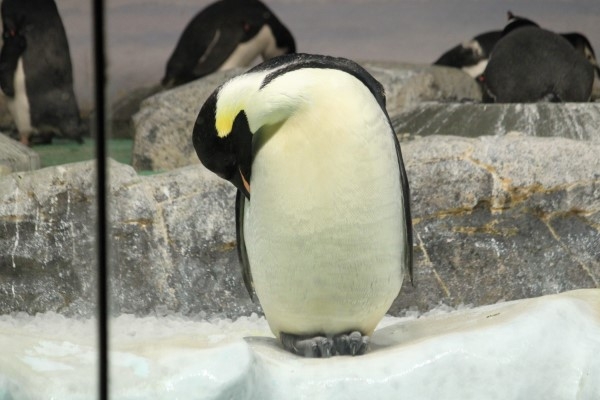 アドベンチャーワールド皇帝の横顔。ソラマメ形のイヤーパッチは閉じておらず、黒い顔と身体側面の黒線との間にスキマがあって、首元のレモン色の部分へと続いています。なので、首を伸ばしたり曲げたりすると、