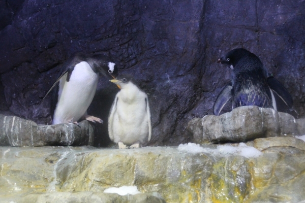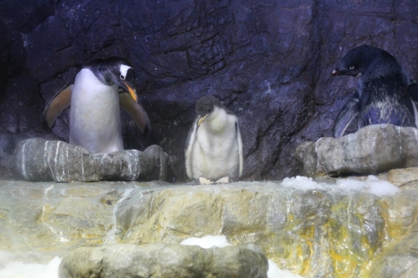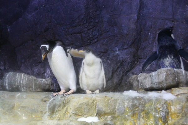 海遊館のジェンツーひな、お家の外に出ましたが、お隣のアデリーににらまれています。近づきすぎると危険です。横目で様子を見ていたお父さん(左)が、向きを変えました。