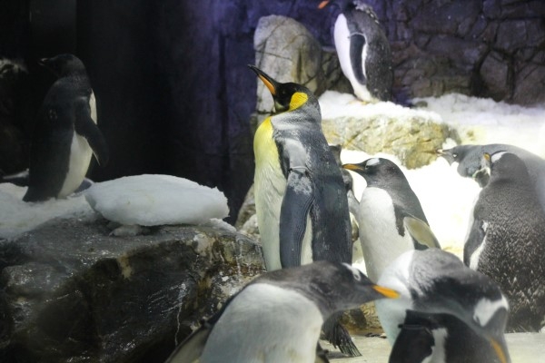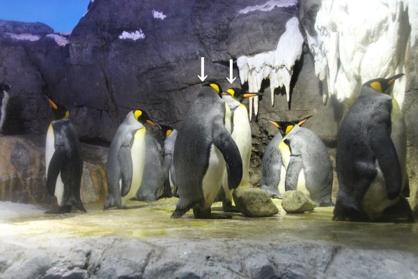 海遊館のキング親子続きです。おなかいっぱいになると、ヒナは頭をお父さんのお腹の下に押し込んでお昼寝タイム。それにしても、キング父はどうしてこんなふうに壁に向いて狭いところで子育てをしているのでしょうか。「周囲からの圧」と前に書きましたが、それは下の写真で。
