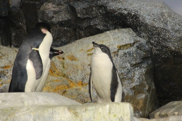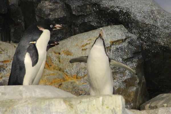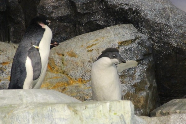 名古屋港水族館のアデリーひな、ベレー帽の形に残った幼綿羽がキュートですが、なんだか目をむいてフリッパーを振り回し、荒ぶる御様子。親は静かに見ています。