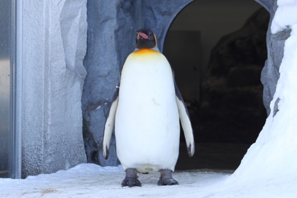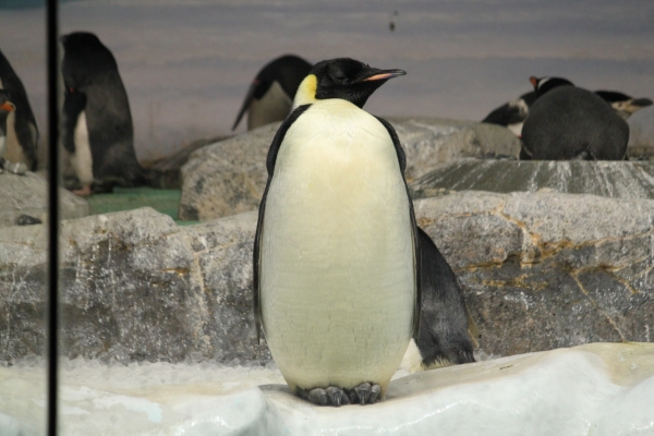 名古屋港皇帝の威厳に満ちたお姿。エンペラーはいつもフリッパーを身体側面にピッタリとつけている感じで、裏側がなかなか見られません。野生ではキングよりも寒いところに棲んでいるので、放熱を少しでも抑えるためでしょう。