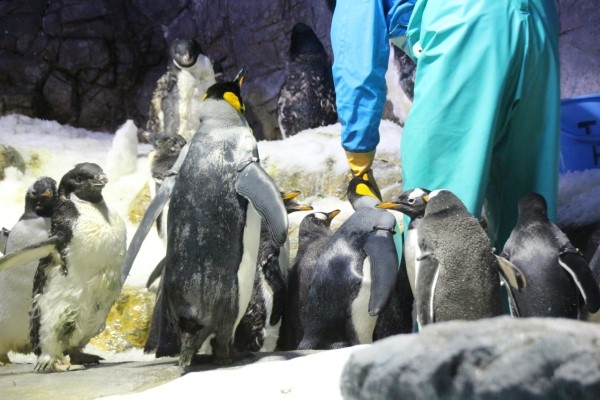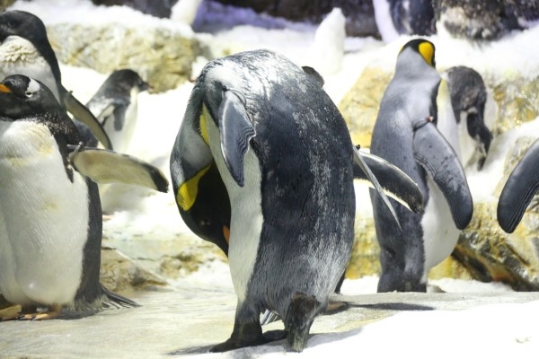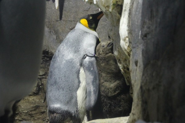 海遊館で子育て中のキング母。ペンギンは交代で育児をします。海へサカナを獲りに行く必要がないので、オフの時はひとりでゆっくりすることもできます。写真は、泳いだ後の羽づくろい中です。