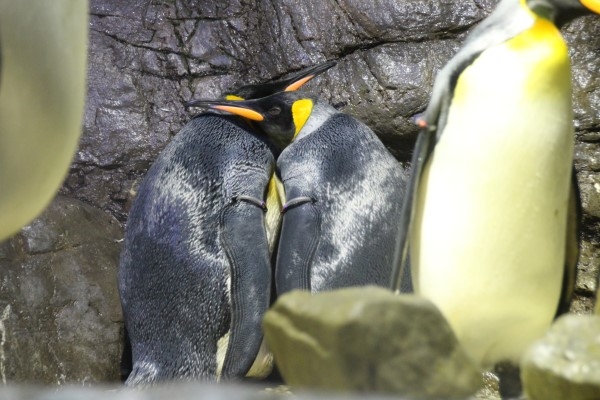 ペンギンの子育てもそれぞれにスタイルがあるようですが、こちらは特に個性的。海遊館、正面奧の壁際で、互いに密着して抱卵しているキングのペア。顔が見えている個体は、ここしばらく取り上げてきた子育てペアのご長男だと思います。タマゴは相方が温めている様子ではありますが、自分も抱卵体勢で付きっきりです。メリハリのきいた役割交代をしている両親とは全く別のタイプです。