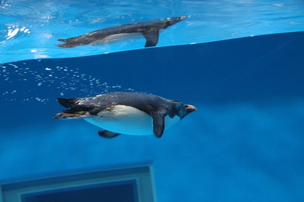 背中からたなびく泡は、羽毛の間にたまっていた空気です。イルカみたいに頭のてっぺんから息を吐くことはありません。