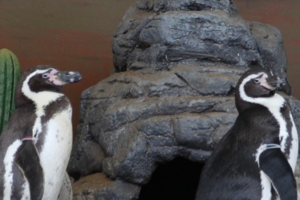 越前松島水族館のフンボルト。野生棲息地のビーチを再現した土の陸場、それぞれのマイホーム前でポーズをとるペアたち、リアル充実のはずなんですが。