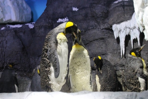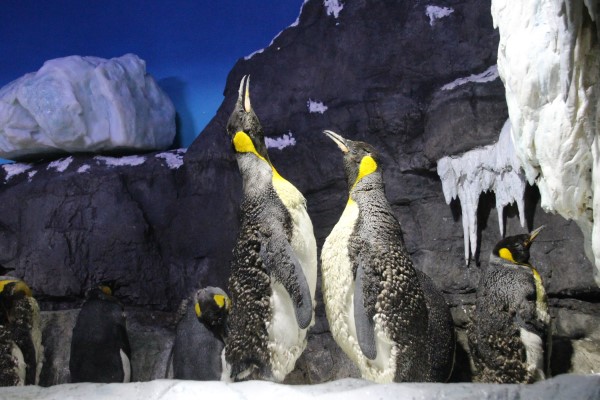 こちらは春の海遊館。キングのペアが鳴き交わしているところです。首をぐい~んと伸ばして高らかに歌います。