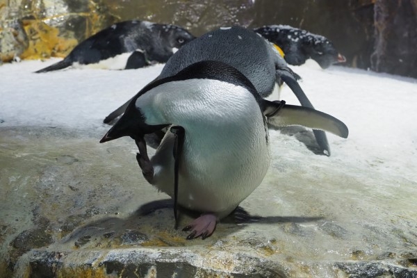 海遊館のアデリーが、目立つ場所で頭をカキカキ。この動作、踊っているように見えるので、私は『ペンギン音頭』と呼んでいます。さて、アデリーの足は何色? ピンクの足に黒い爪。キュートですね。