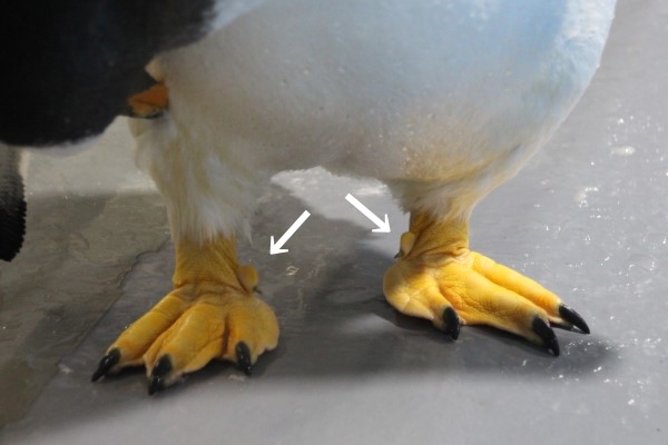 黄色い足に黒い爪。足指の数は4本です。接地するのは3本、接地しない小さな指にもちゃんと爪がついてます(矢印)。爪の色はどの個体もほぼ黒ですが、たまに薄い色のも見つかります。