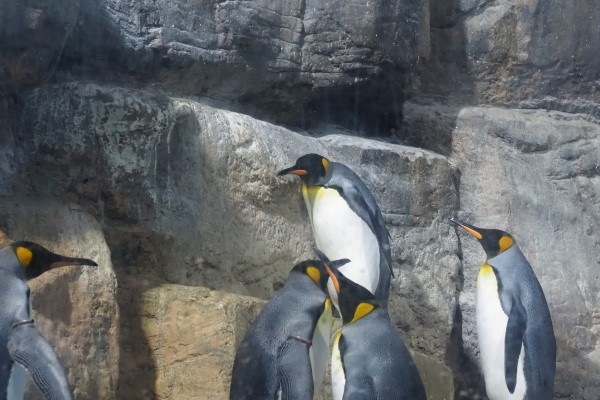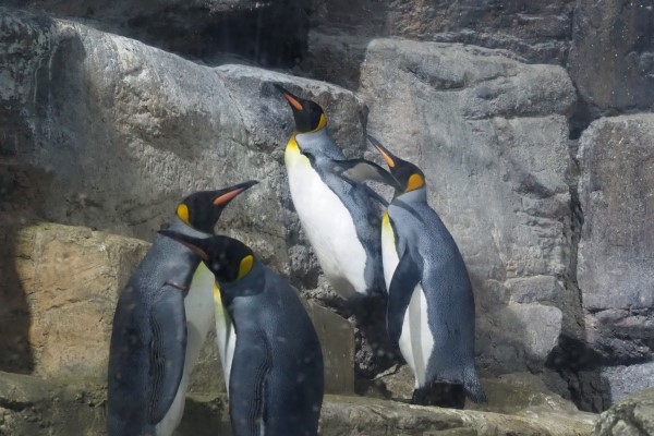 八景島のキング、前回はテラスに展開して4段飾りになってました。(今回は3段です。) 今回は段を上がるところです。上にいる2羽のうち1羽が上がろうとしています。相方は応援しているふう。
