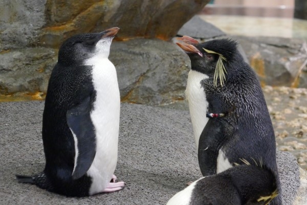 海遊館のミナミイワトビ、左は亜成鳥、右は成鳥です。ヒナのモコモコ綿羽が抜け落ちてオトナの泳げる羽になったら、次の換羽までは亜成鳥。成鳥とは外見が少し違います。イワトビの場合、一番目立つのは黄色い冠羽の有無。冠羽がないと、まるで別種のようですね。亜成鳥の白いホッペはだんだん黒くなっていきます。