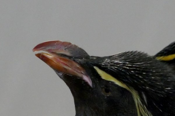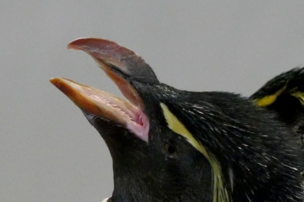 お口を開けると、中はかわいいベビーピンクでした。口の中にびっしりと突起がついているのは、どのペンギンも同じです。頭から口に入れたサカナをうまく呑み込めるようになっております。モデルは海遊館のミナミイワトビ。