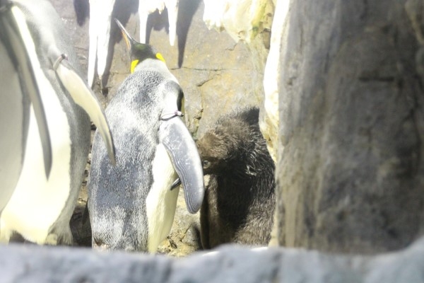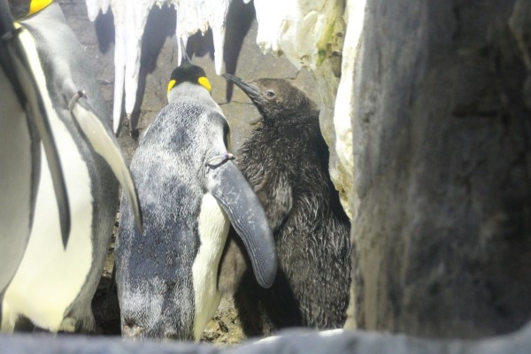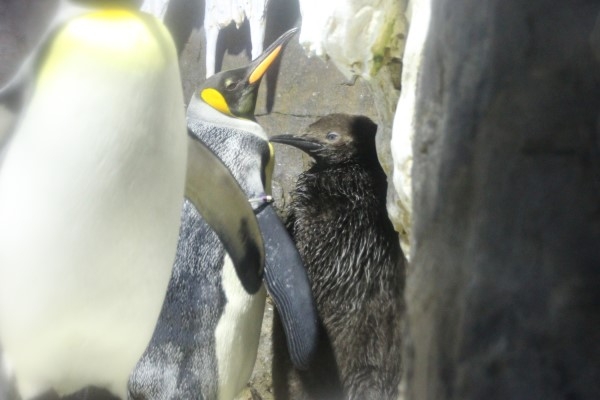 海遊館のキング母子、接近者がとだえてちょっと一休みの図。ヒナの表情がちょっと満足そう。