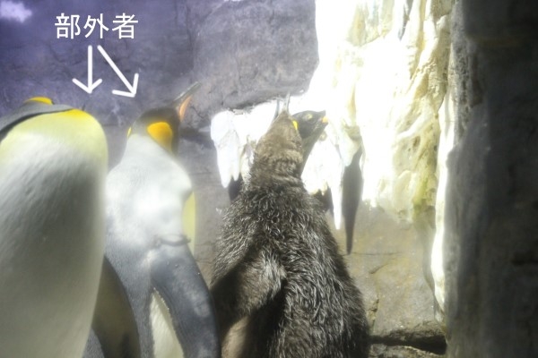 ヒナも真似して歌っています。ヒナが少し移動したので、お母さんはヒナの向こうに顔だけちょっと見えています。当然のようにヒナに近づく部外者。手前は、その部外者に警告している別の部外者で、自分が仲良しと一緒にいるので、こっちに来るなと言っているのでしょう。