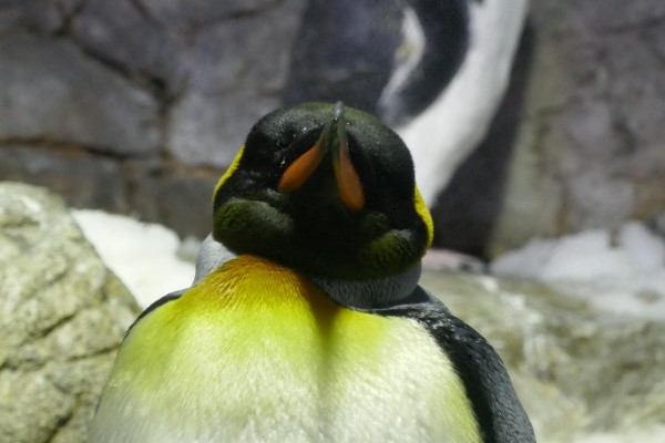 で、ペンギンがS字をグッと縮めると、短い首。首回りのポッコリ段々は、高齢だと出やすくなるようです。