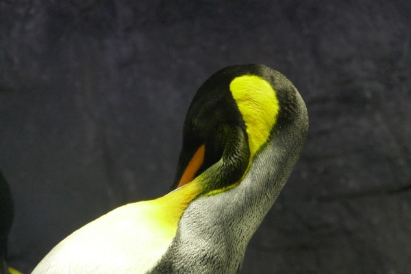 首のS字をぐーんと伸ばして首筋をクチバシでカキカキ。長い首。モデルはどちらも海遊館キングでした。