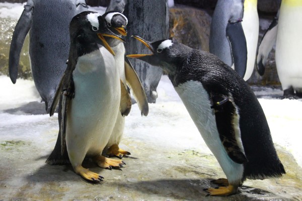 いきなり単独ジェンツーがケンカを売りに。目の前でいちゃつく『リア充』ぶりにイラついた、のでしょうか? 応戦する仲良しジェンツー。口喧嘩です、ツツキ合いにはなりませんのでご安心を。