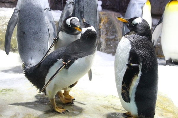 仲良くしているジェンツーのペア。そのすぐ近くに佇むもう1羽。海遊館です。