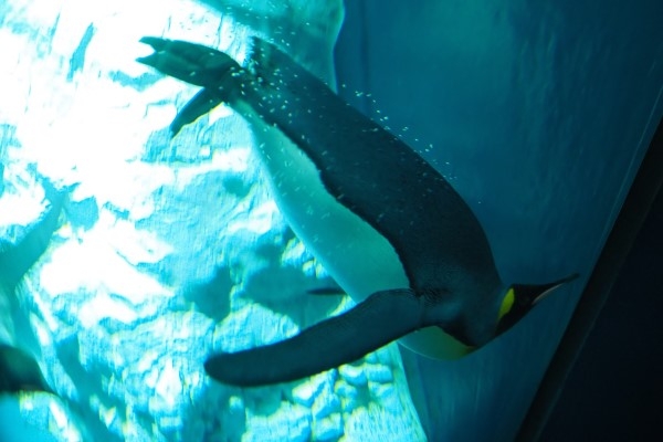 前回と同じく海遊館のキング。プールの隅をクチバシでなぞるようにしながら水中を上昇しているところ、アタマがめちゃ小さい! 身体はふつうに見えるのですが。