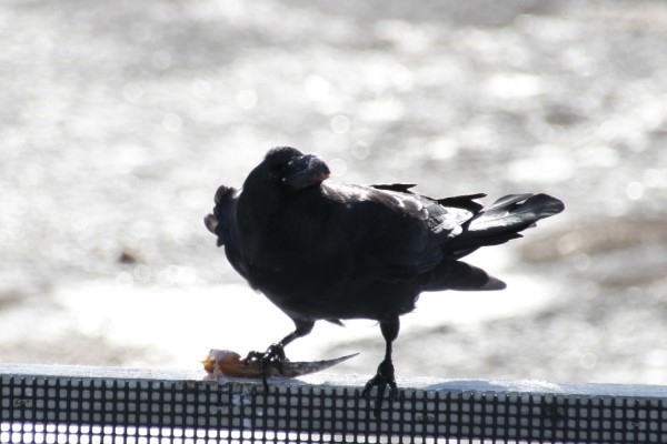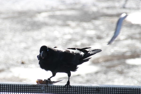 カラスです。おたる水族館、子供アザラシのフィーディングタイムで、まずサカナを1匹ゲット。フェンスの上で様子をうかがいながら、つついて食べています。