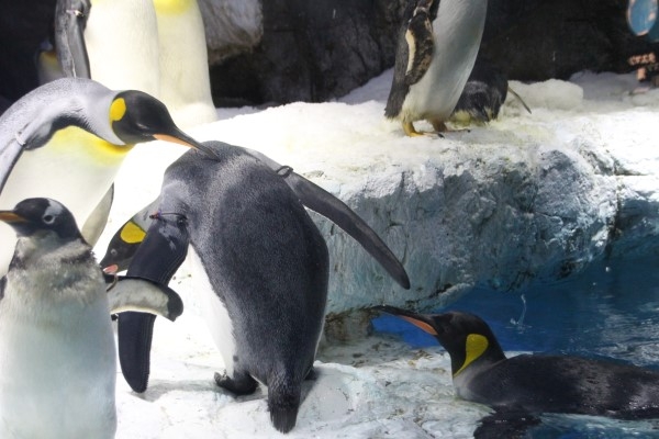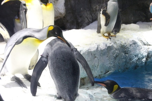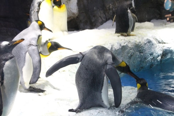 海遊館のキングです。上陸スロープに立つ1羽と、水上を接近してきた1羽。